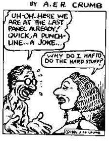 In the first few years of the decade, Crumb continued to traverse the country and draw. But by 1974, Crumb moved from what had become a commune in Potter Valley and settled down in Madison, California with his new girlfriend, Aline Kominsky (later to become his second wife). He stopped smoking marijuana at that time. He drew a “Mr. Natural” strip which ran in “The Village Voice” for about a year (later compiled as “Mr. Natural #3”). He also started playing banjo and mandolin in the Cheap Suit Serenaders Band, which usually performed in the Bay area.
