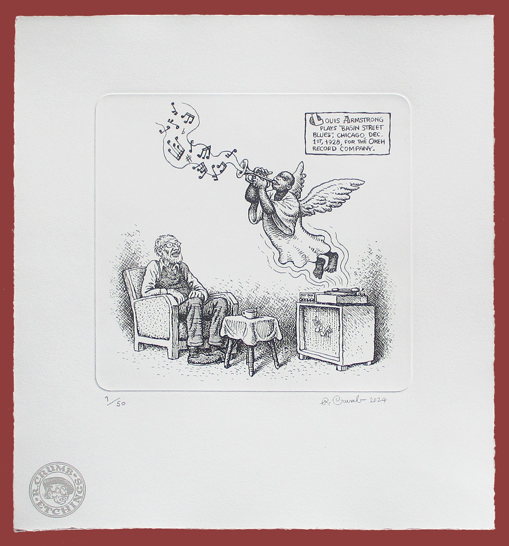 Crumb drew this illustration in 2021 and we very quickly agreed that it would be the next image in line for an etching edition. Since we already published a portrait etching edition of Louie Armstrong in 2012, we decided to entitle this one as Basin Street Blues. The Hahnemuhle white archival paper is 12" x 13." The embossed area is 8" x 7.5." The actual image is about 7" x 7." There are 50 prints in this edition, with 6 artist proofs and 3 printer proofs. Each print is numbered, signed and dated by Crumb. Your satisfaction is guaranteed.