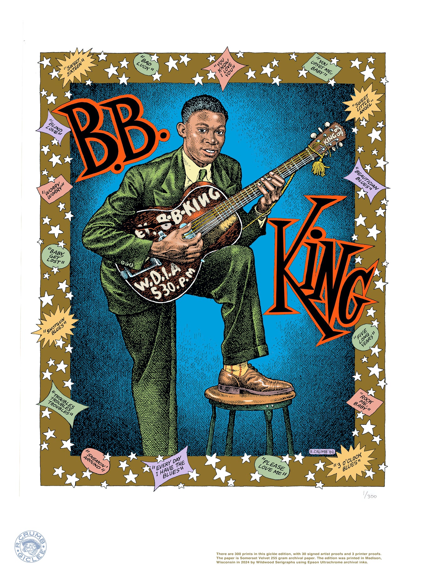 In 2002, Crumb drew a portrait for a serigraph edition which was to be signed by BB King and R. Crumb. BB's management didn't really understand Crumb's artwork, or the influences Crumb was using from the mid-'50's Blues album covers and show flyers from that period. So they rejected Crumb's full-length portrait. This resulted in the top half of the portrait being modified. But finally, this portrait–the original version– is presented in full color as Crumb first intended, using Crumb's excellent color guide and mid-fifties R&B poster references.