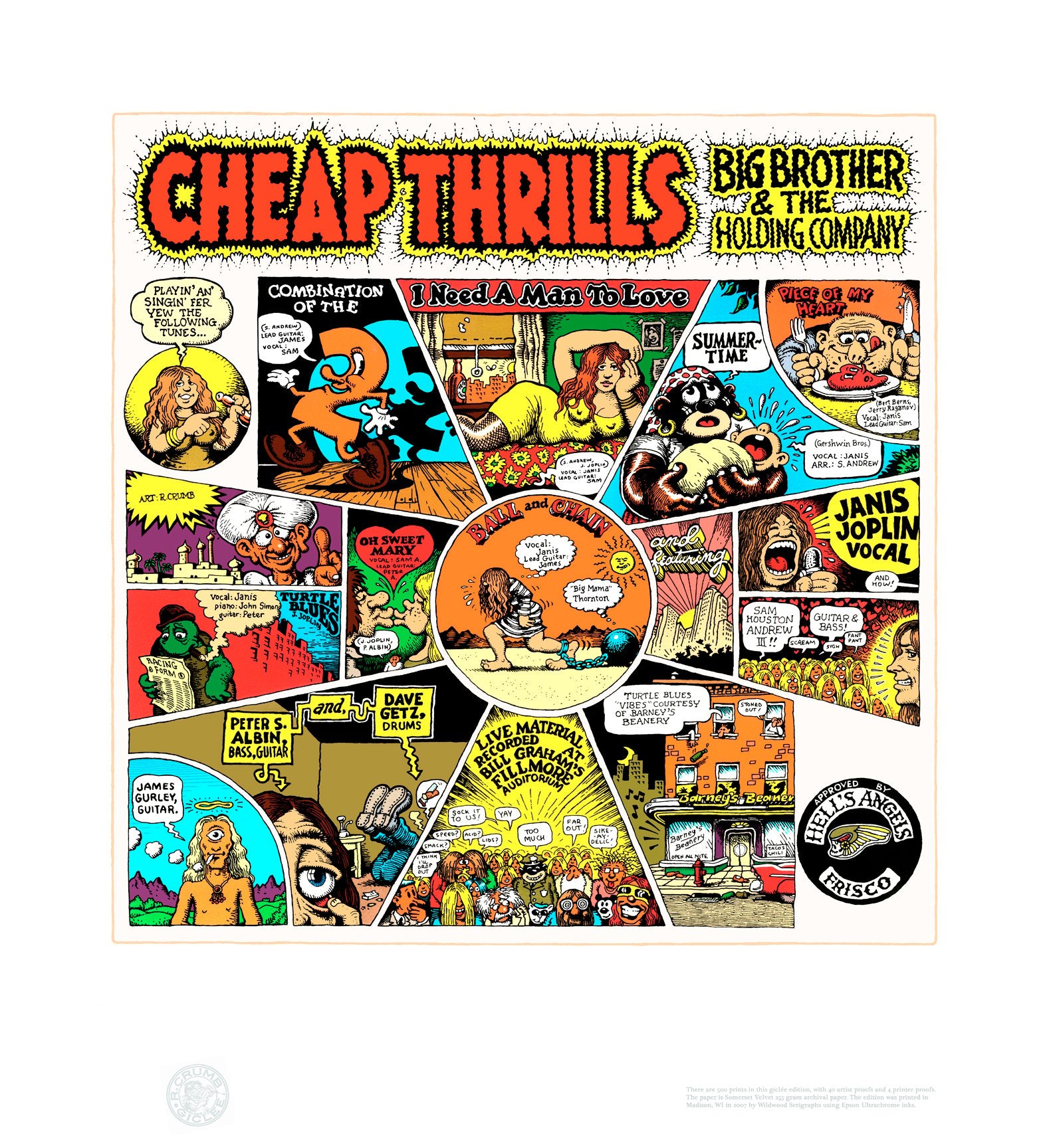 We released Crumb’s classic Cheap Thrills as a giclee edition. Each print is from an unsigned but numbered edition of 500. We try and sell our giclee prints for $90 each, but as Big Brother and Holding Company and the Estate of Janis Joplin must be paid royalties for the use of their names and likeness, we must increase the Cheap Thrills giclees to $120. The detail and color vibrancy is extraordinary.
