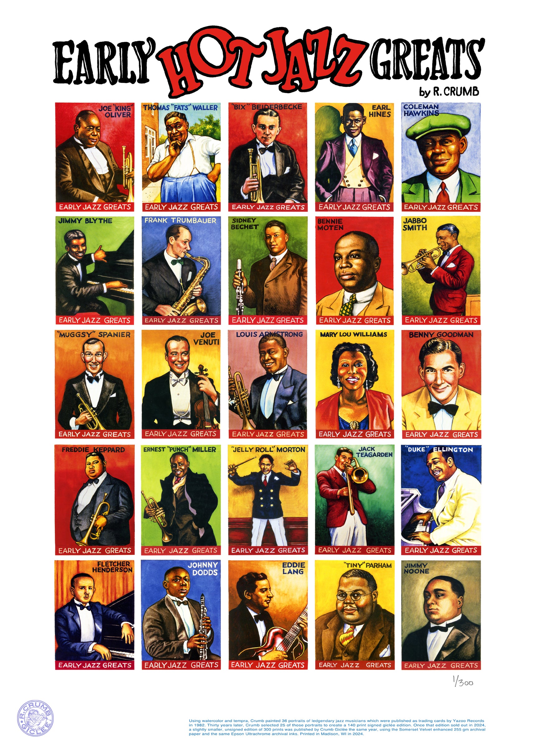 Using watercolors and tempera, Crumb painted 36 portraits of legendary early jazz musicians which were then published as trading cards by Yazoo Records in 1982. Thirty years later, Crumb selected 25 of those portraits to create a 140 print signed giclée edition. Once that edition sold out in 2024, we are now releasing a slightly smaller, unsigned giclée edition of 300 prints. Using 255 gram enhanced Somerset Velvet archival paper and Epson Ultrachrome archival inks, we attain a rich, saturated print which looks almost identical to the original watercolors. The paper is 18" wide by 24" tall. The image is 13.5" by 20" tall. Each print is hand-numbered and comes with our guarantee for your satisfaction.