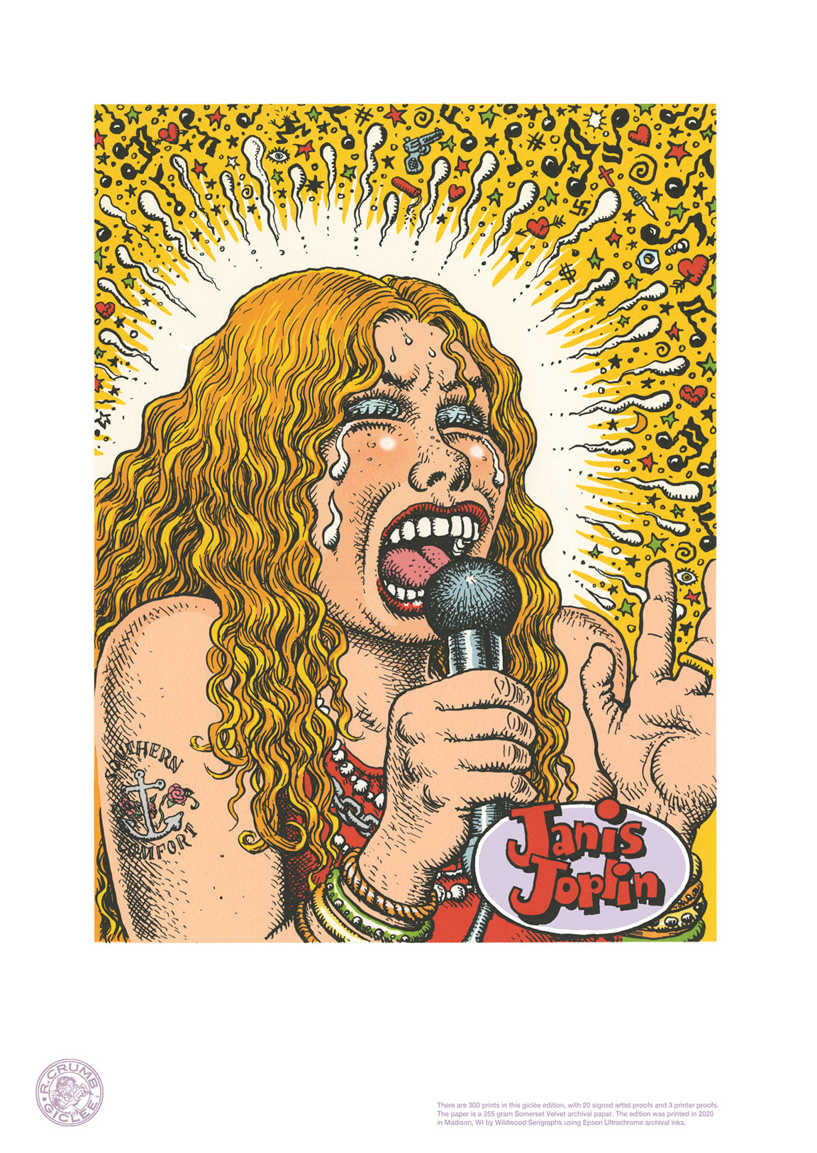 Crumb first drew a pen and ink cartoon/portrait of Janis Joplin in 1969. This is not that portrait! Almost 30 years later, Crumb drew another portrait of Janis (in the same pose and with the same background) which is this portrait. We released this portrait as an etching in 2008. In 2019, Crumb colored the portrait for a screen printer in Europe who produced a screen print edition of this image (120 prints). With slight variations, we're now offering Crumb's colored version of his portrait of Janis Joplin with a 300 print giclée edition.