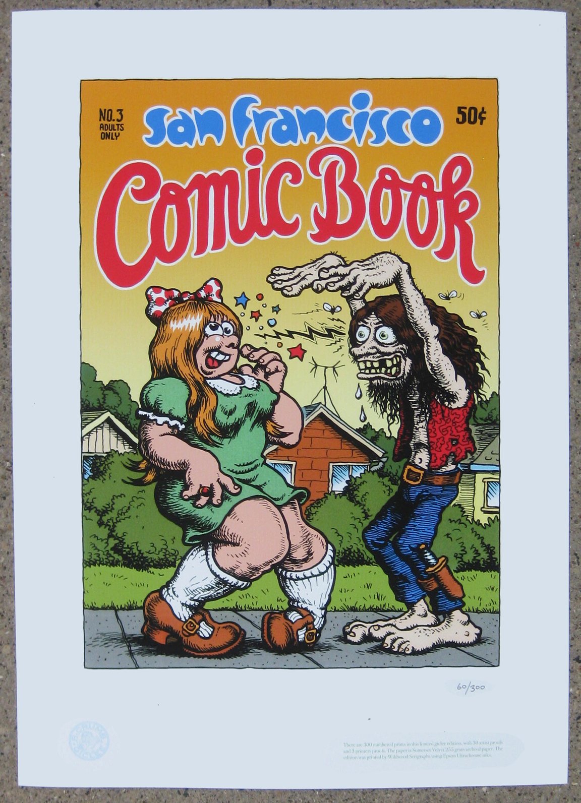 Because of the many requests for this image, we're pleased to release a new giclee edition of San Francisco Comics. Drawn for the cover of San Francisco Comics (#3) in 1970, this image was later used to create a signed limited edition serigraph in 2009. That edition sold out several years ago, and we're now releasing a new unsigned but hand-numbered version of it. The giclee edition is slightly smaller with brighter grass and a more pale hippie skin.